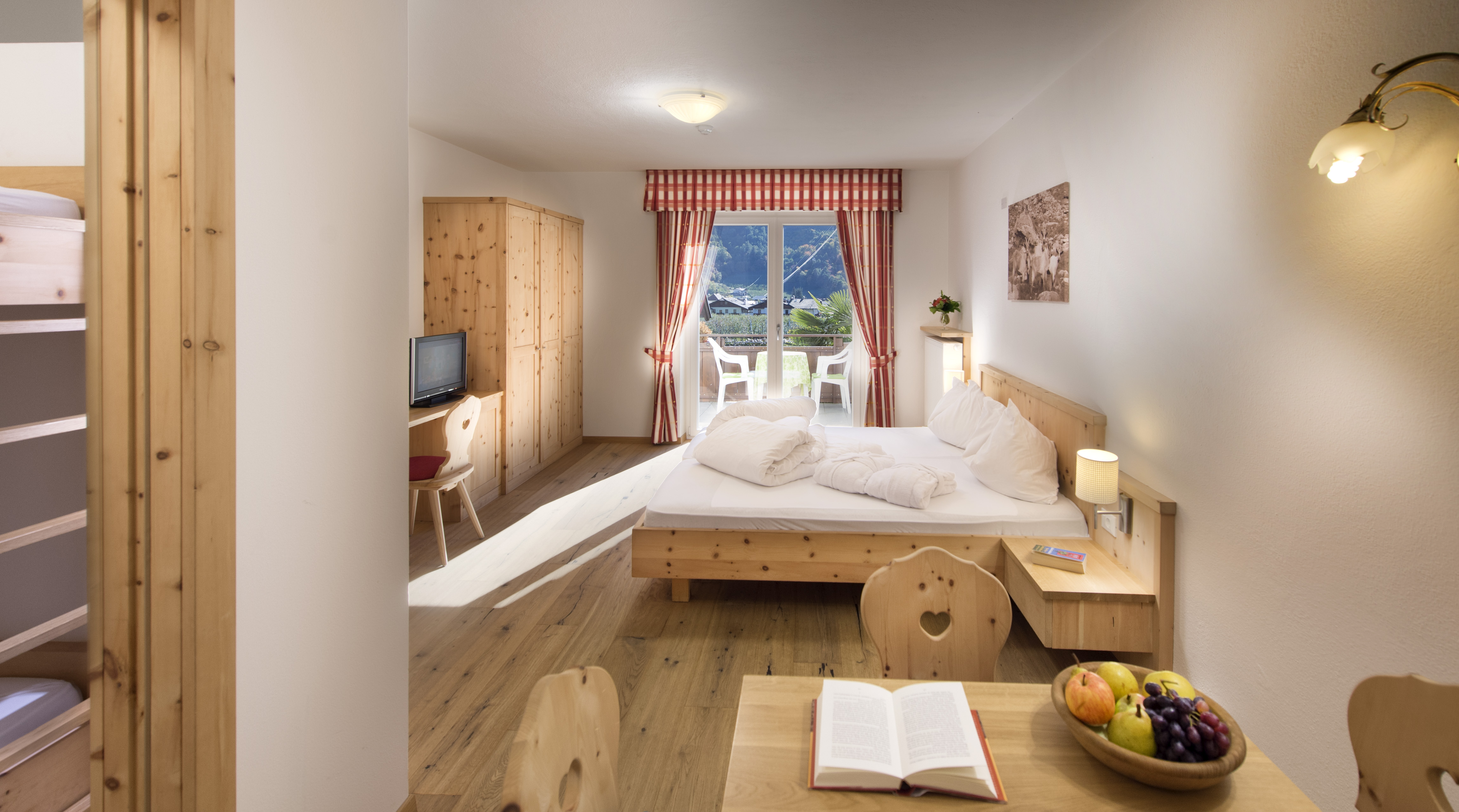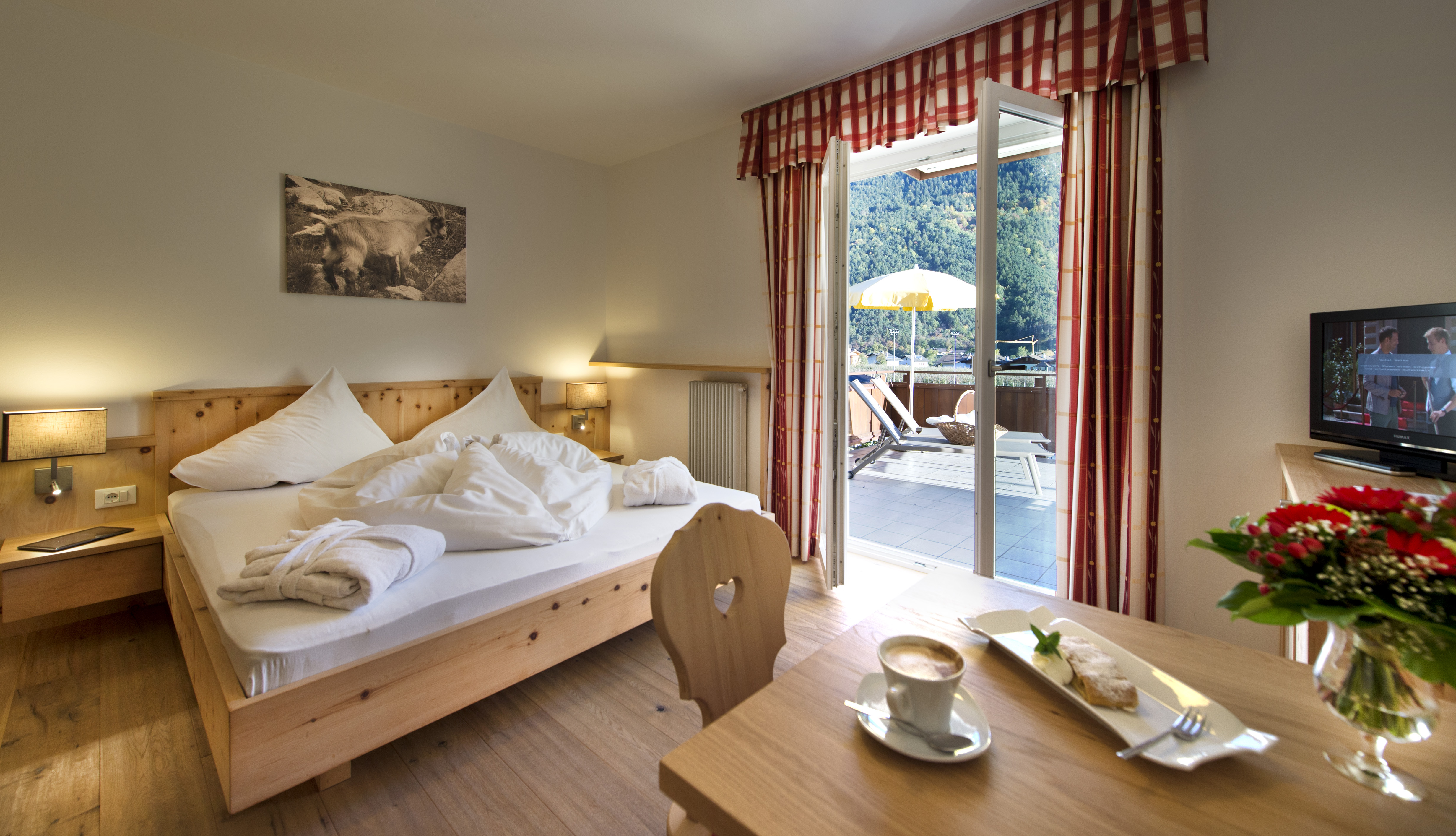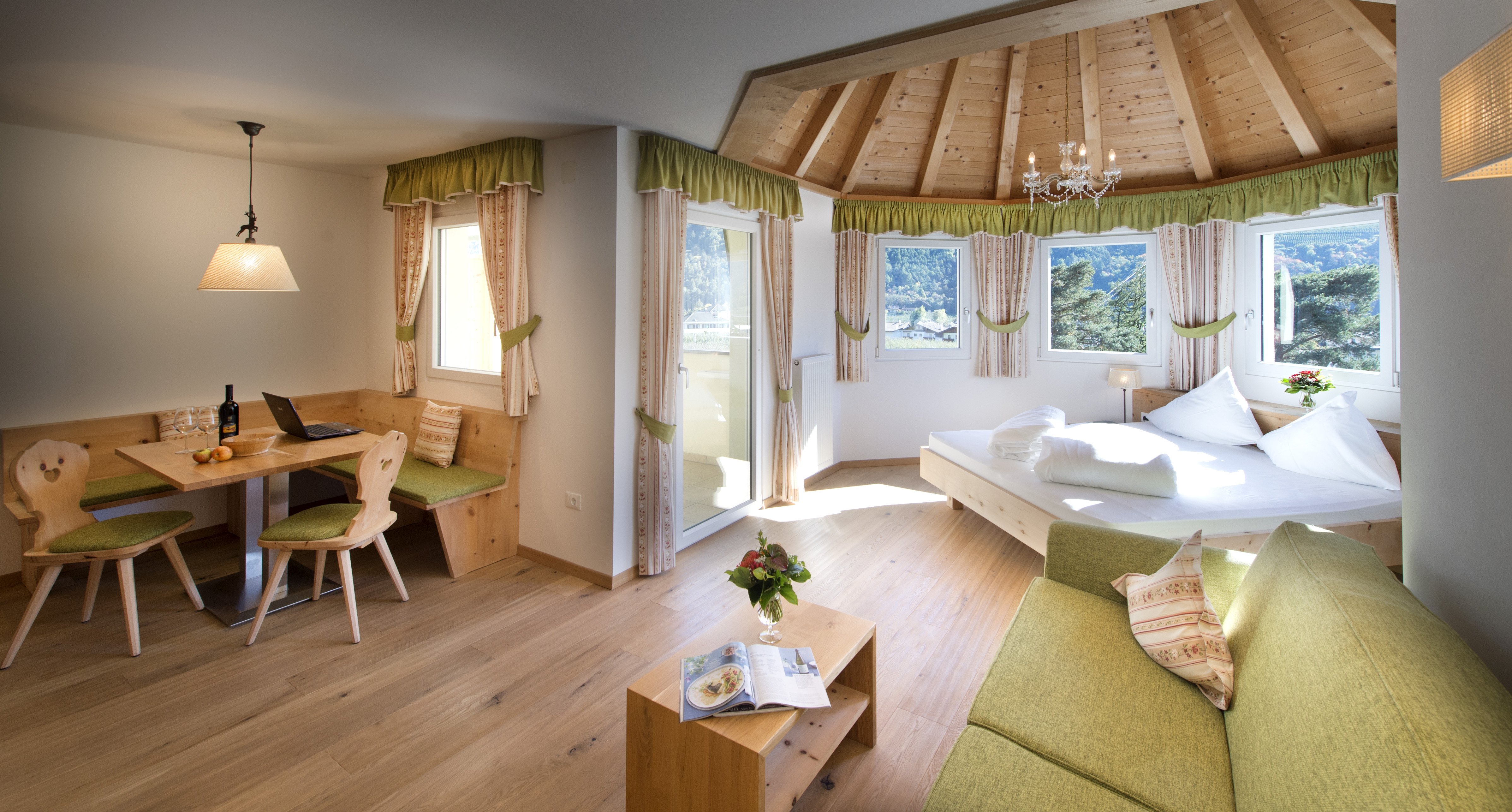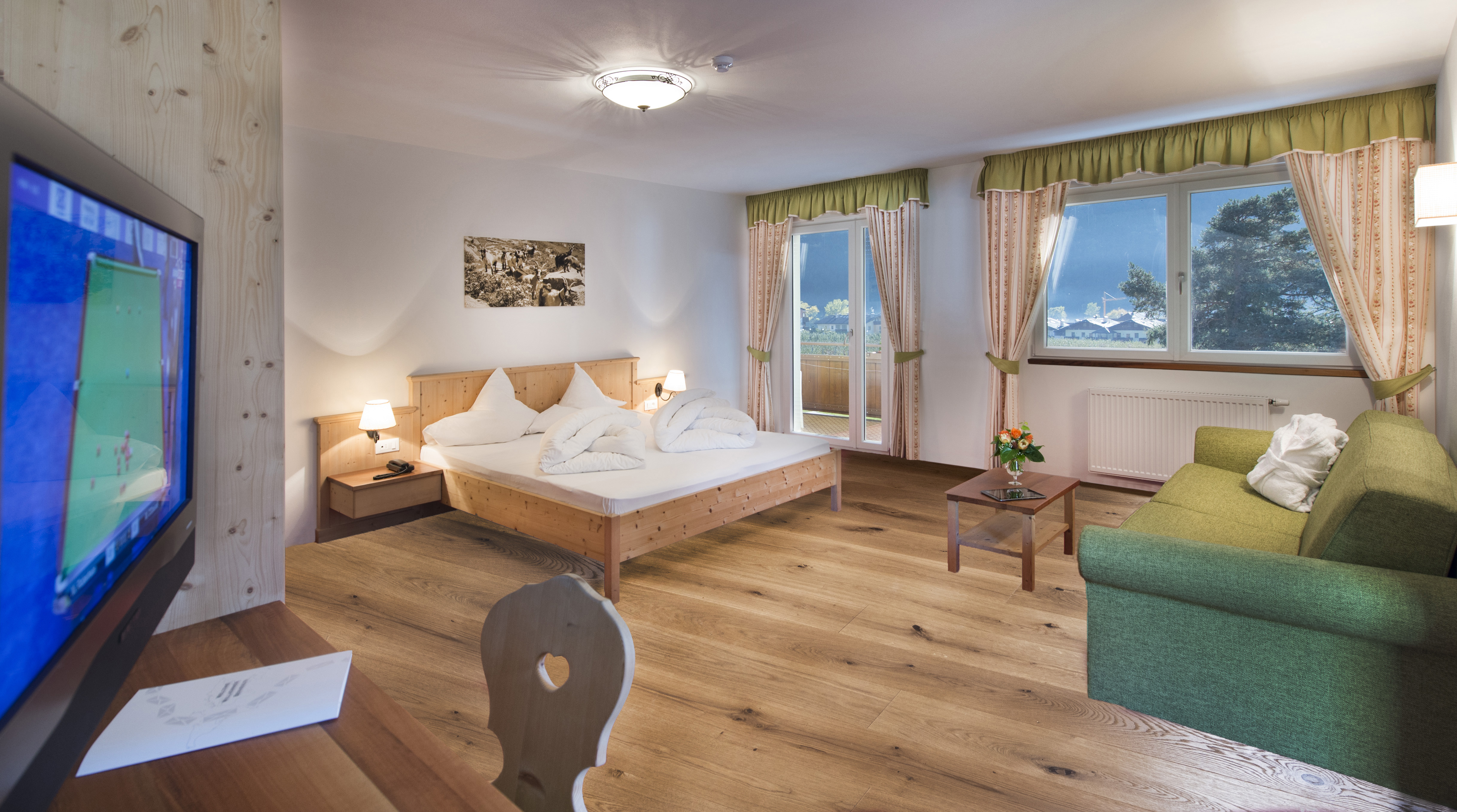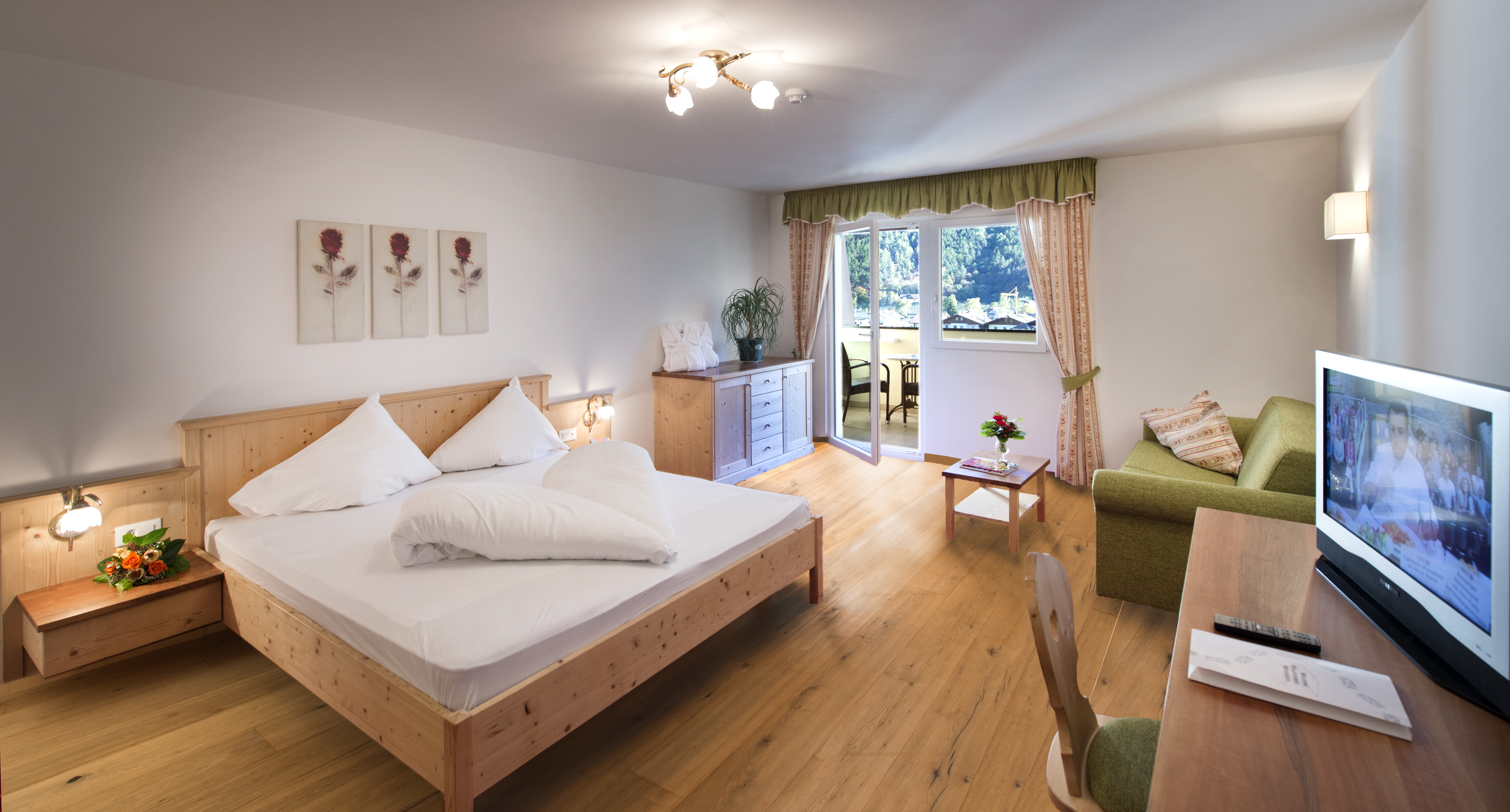 Ruhige und geräumige Suite in Zirbenholz, abgetrennter Schlafbereich für Kinder mit Etagenbett, Holzboden, Schreibtisch, Flatscreen-SAT-TV, Radio, Zimmersafe, Minibar, Telefon, Badezimmer mit Dusche, WC und Haarföhn, Südbalkon.