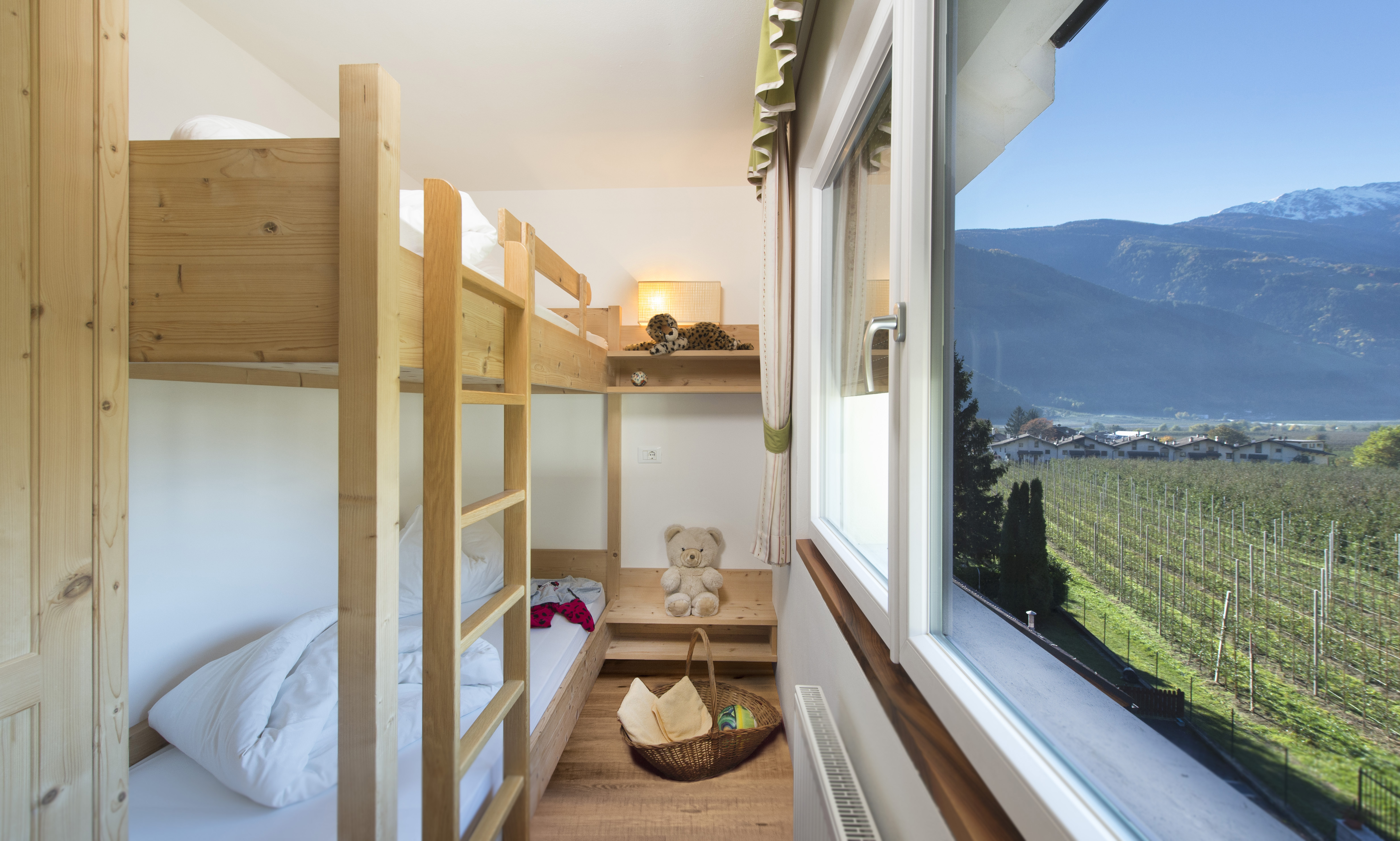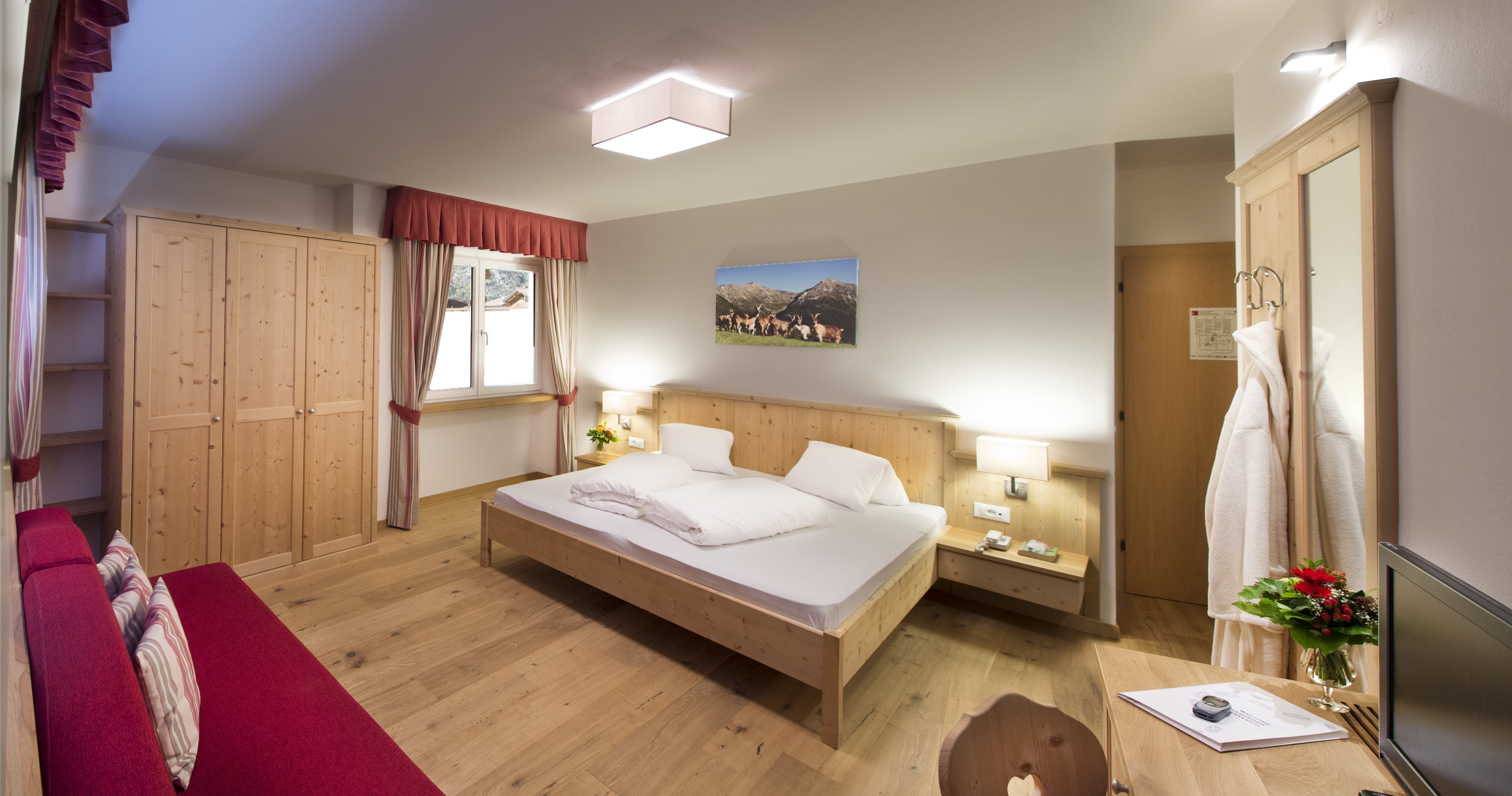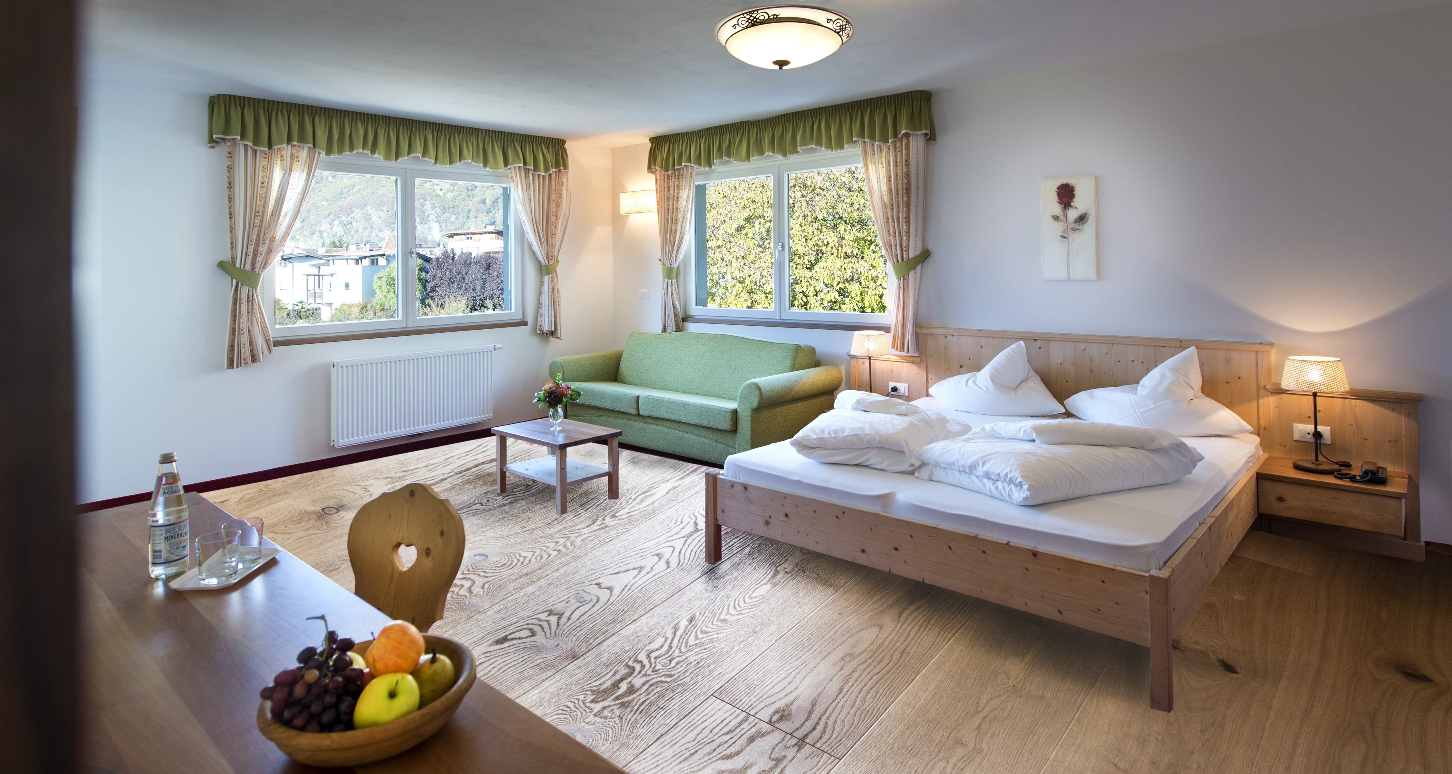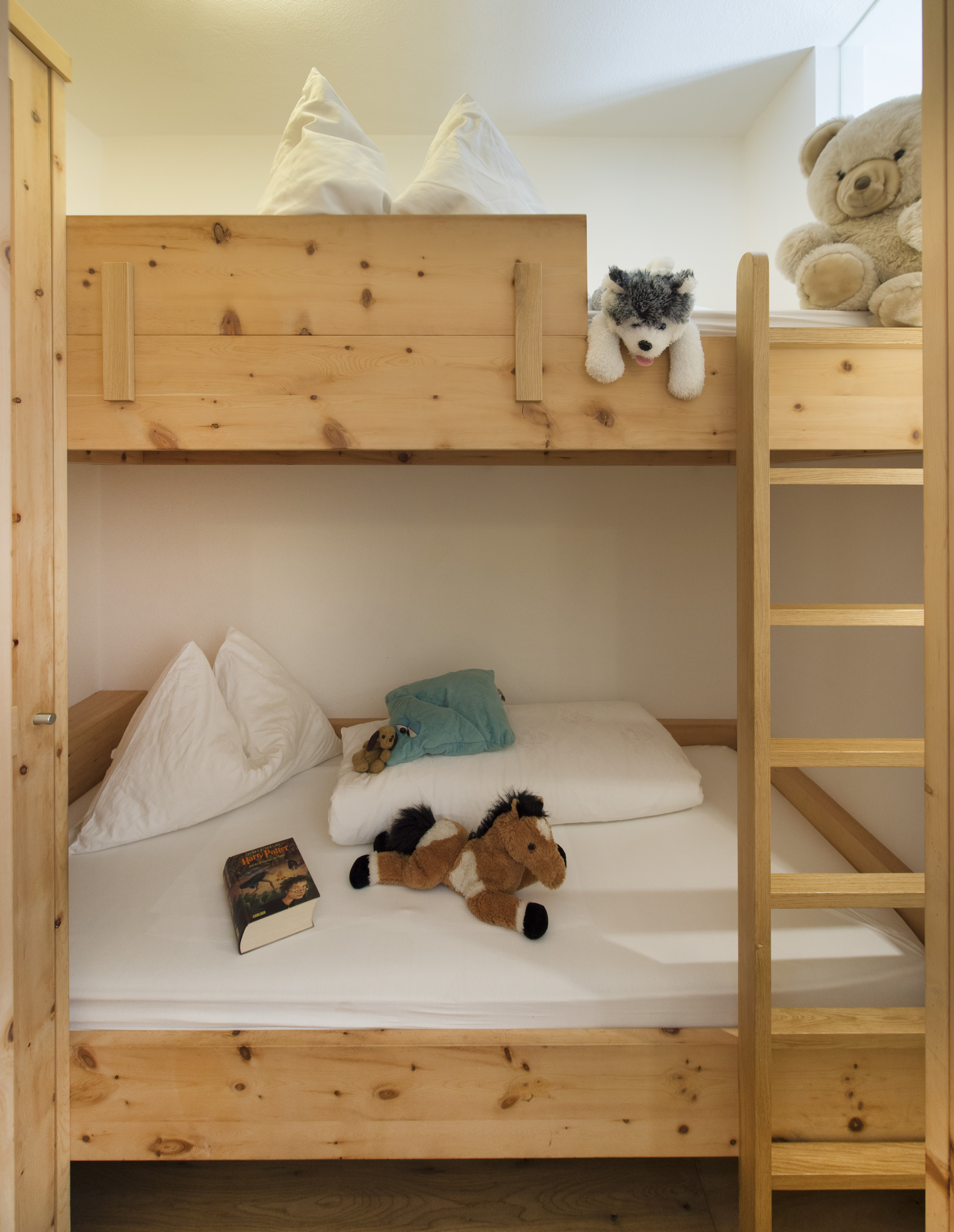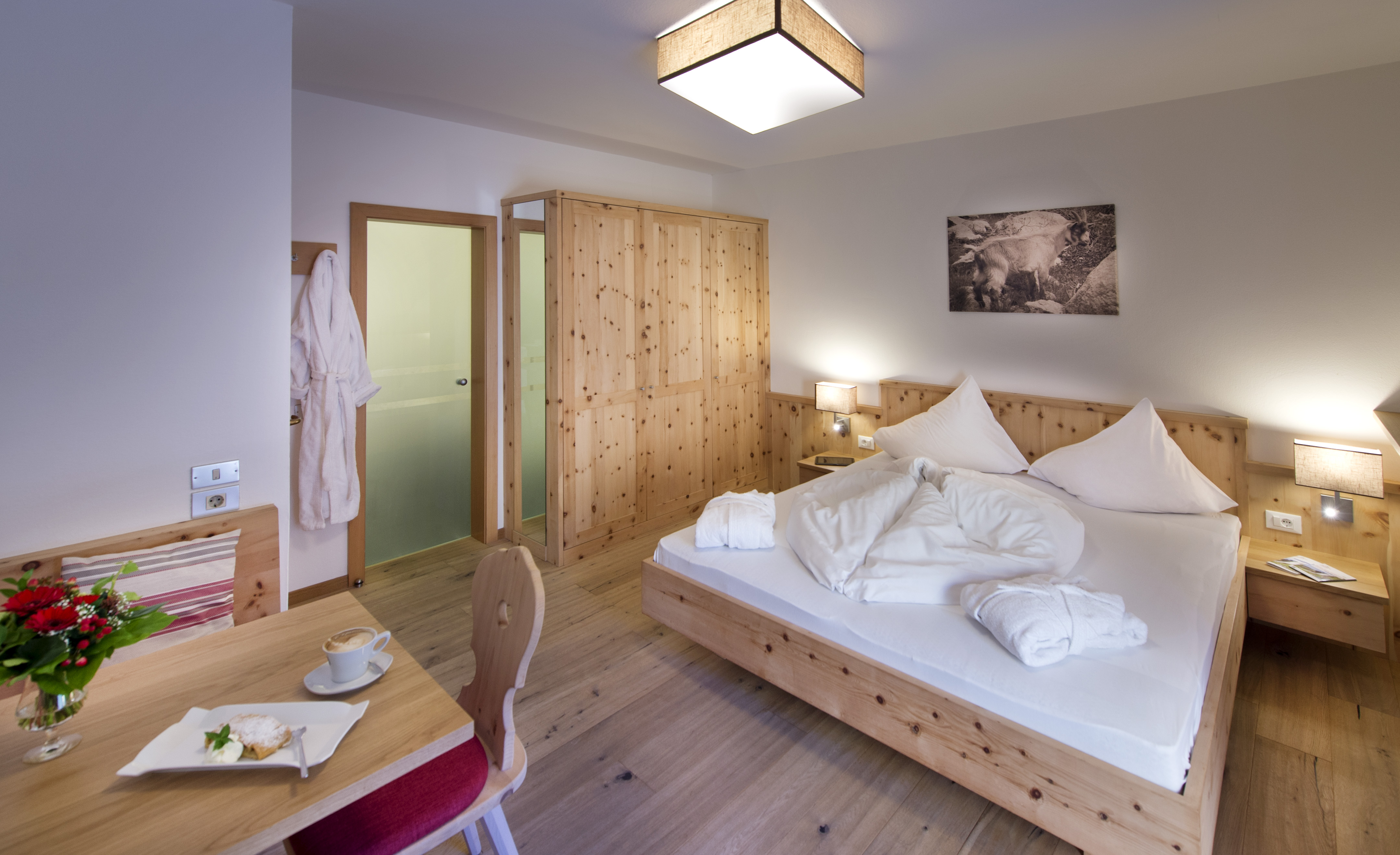 Ruhige und geräumige Suite in Zirbenholz, abgetrennter Schlafbereich für Kinder mit Etagenbett, Holzboden, Schreibtisch, Flatscreen-SAT-TV, Radio, Zimmersafe, Minibar, Telefon, Badezimmer mit Dusche, WC und Haarföhn, Südbalkon.