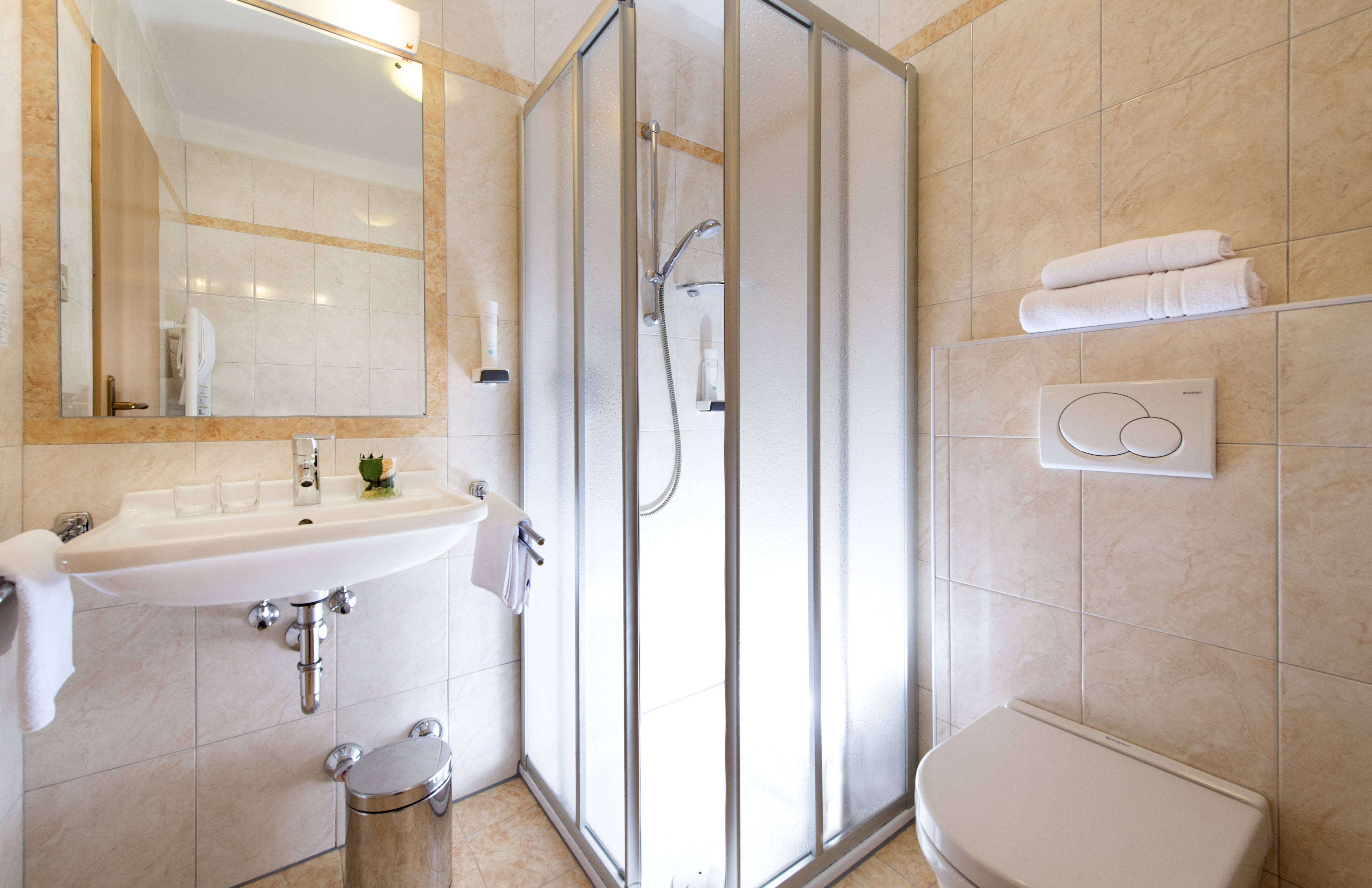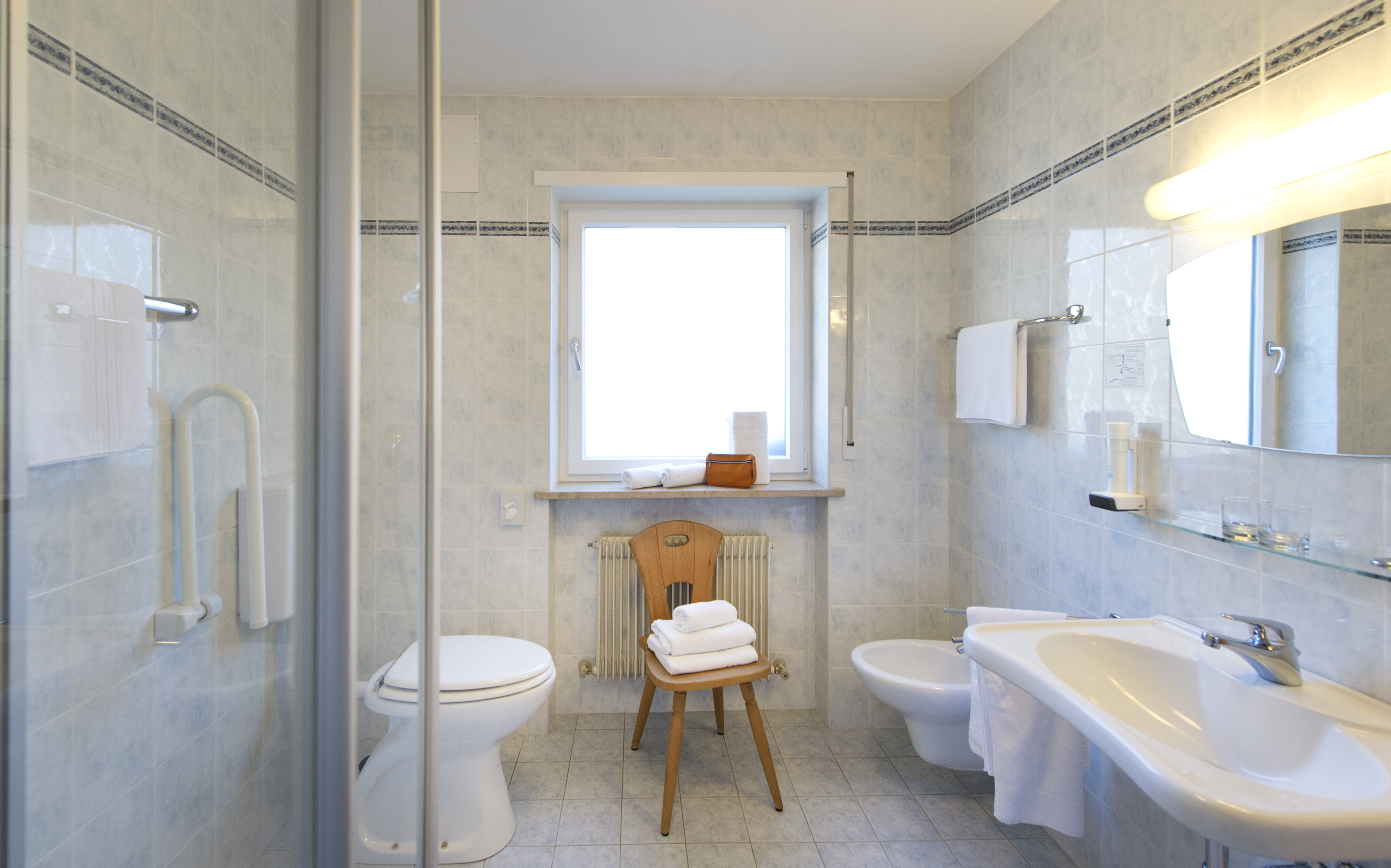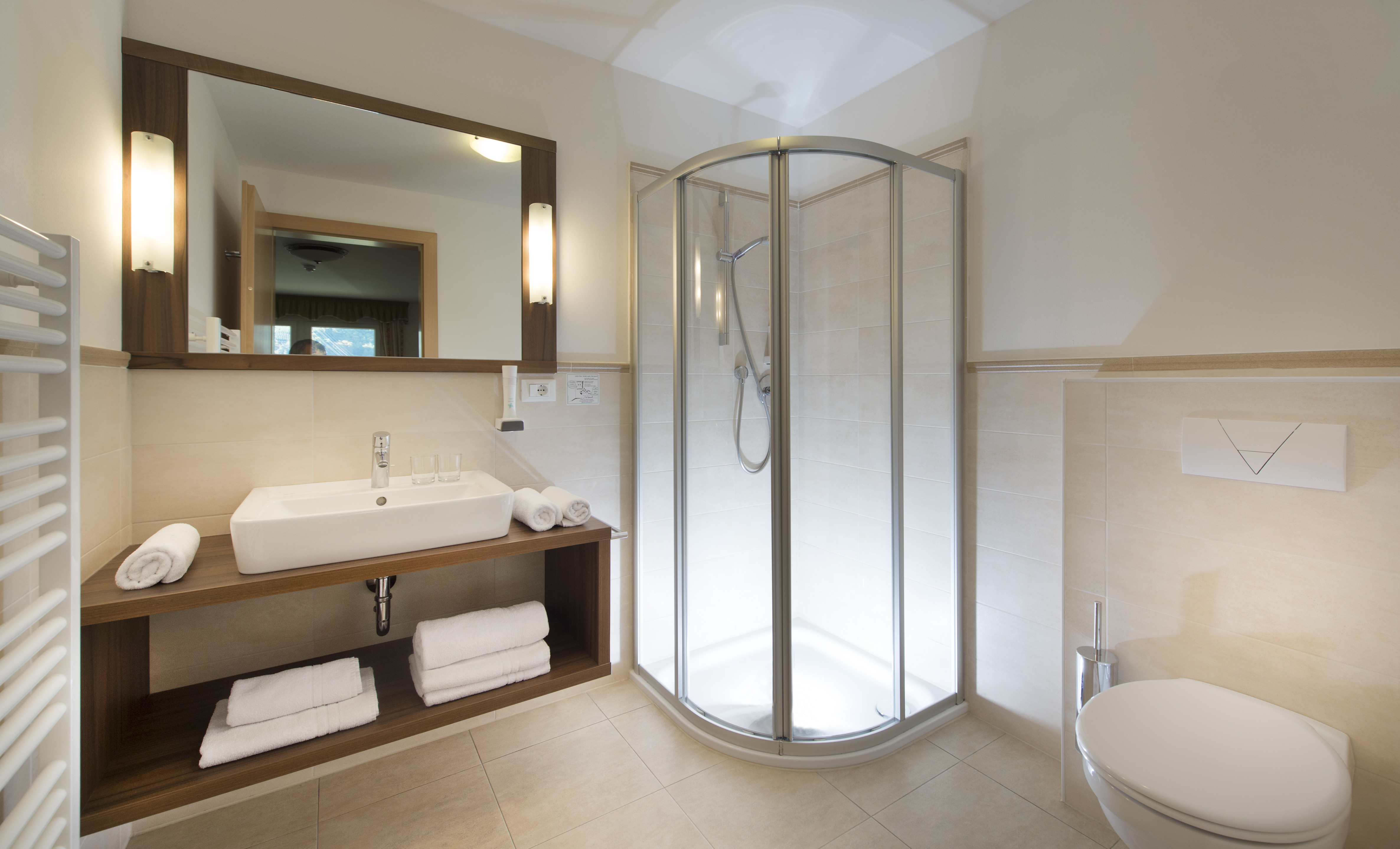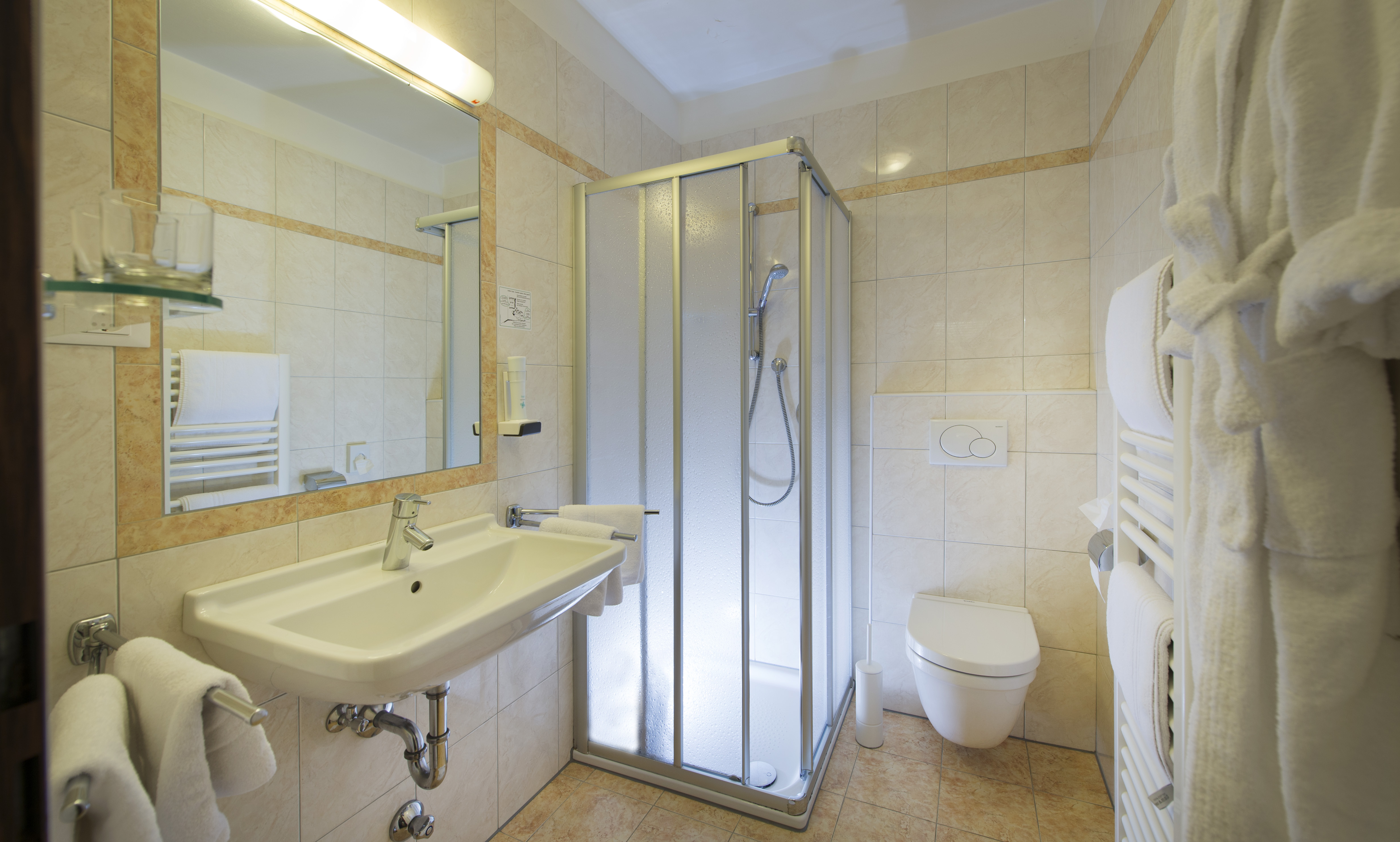 Gemütliches, ruhiges Zimmer in Zirbenholz, Holzfußboden, Sitzgelegenheit, Sat-TV, Radio, Tresor, Telefon, Minibar, Badezimmer mit Dusche/WC, Haarföhn, Südbalkon mit Blick auf das Freibad.