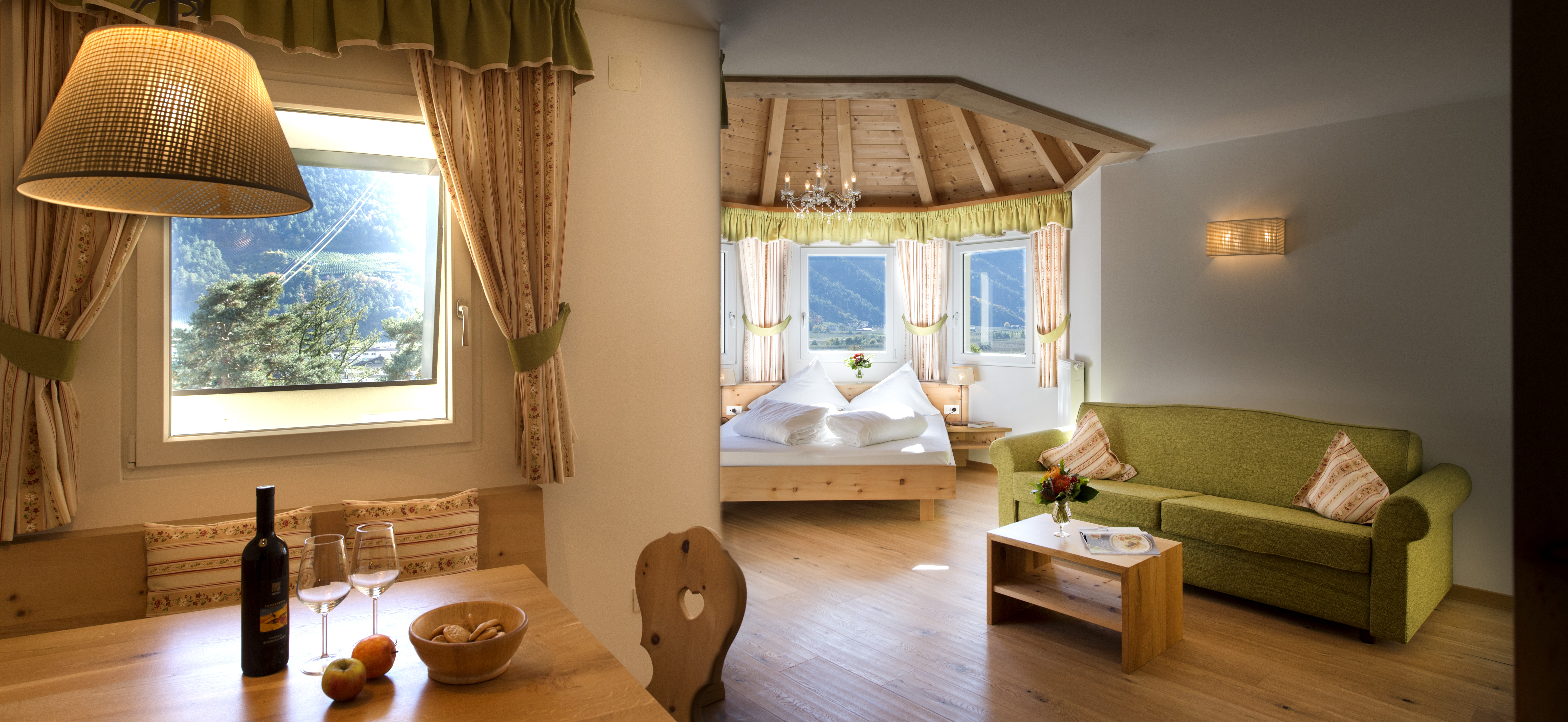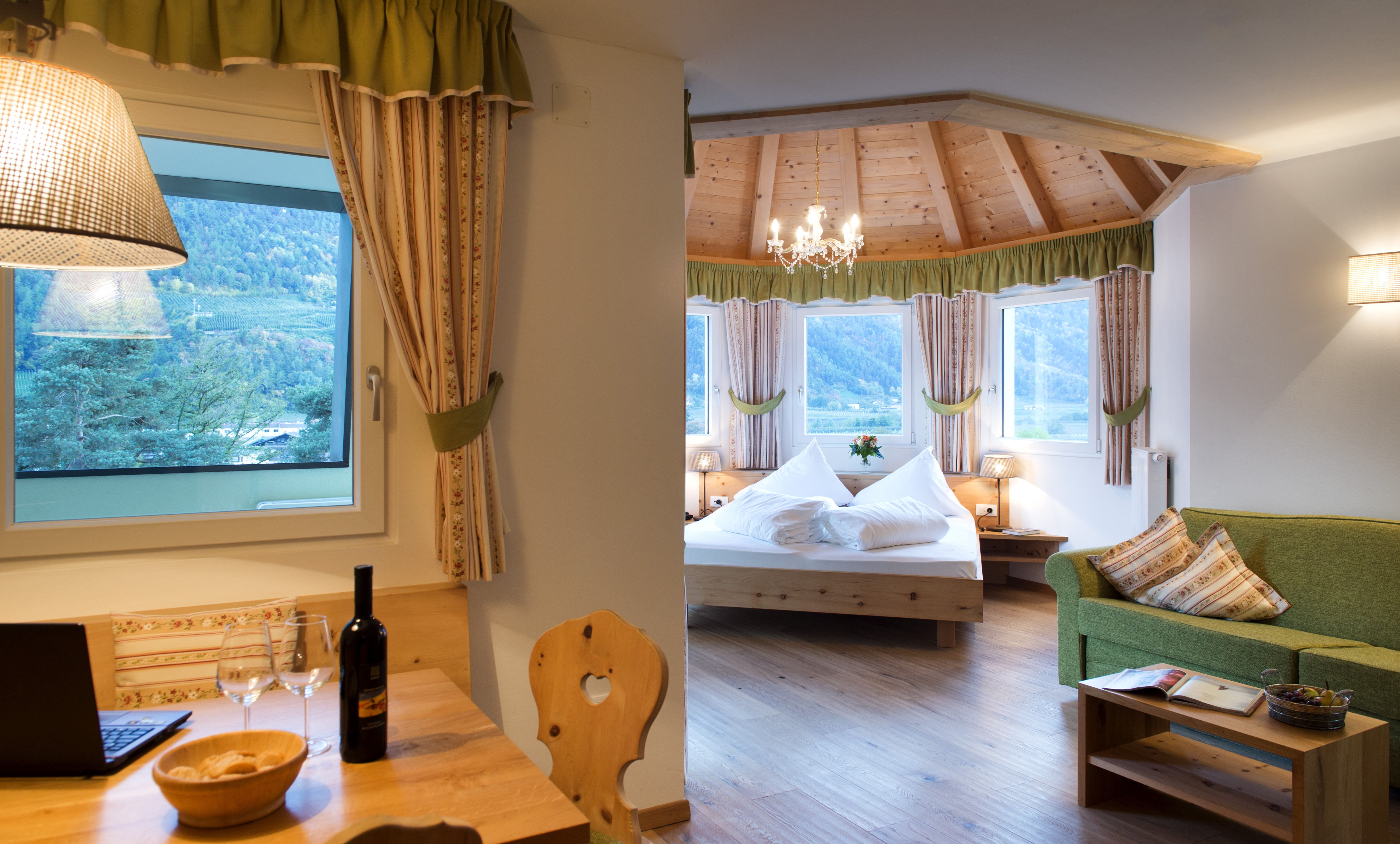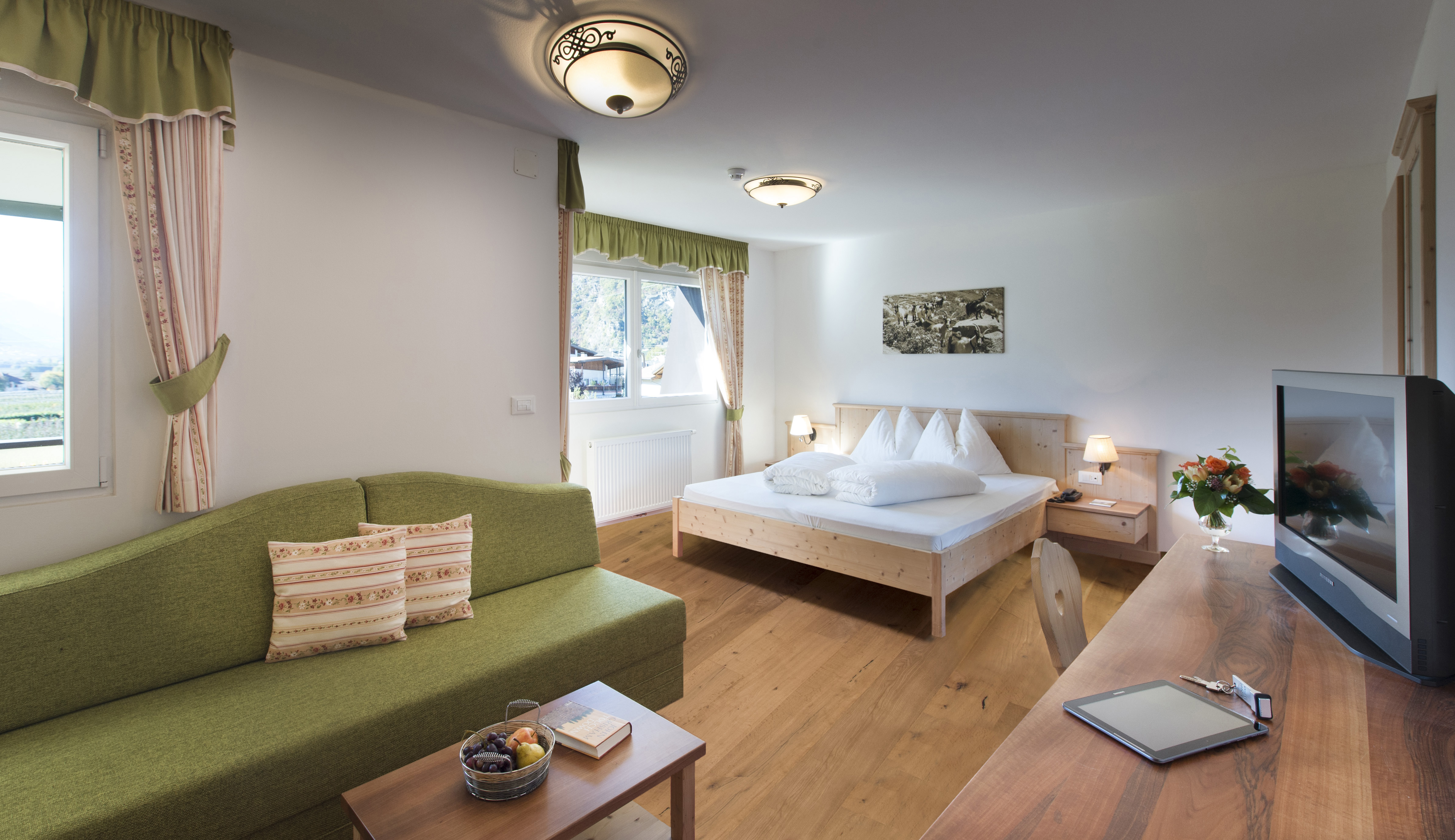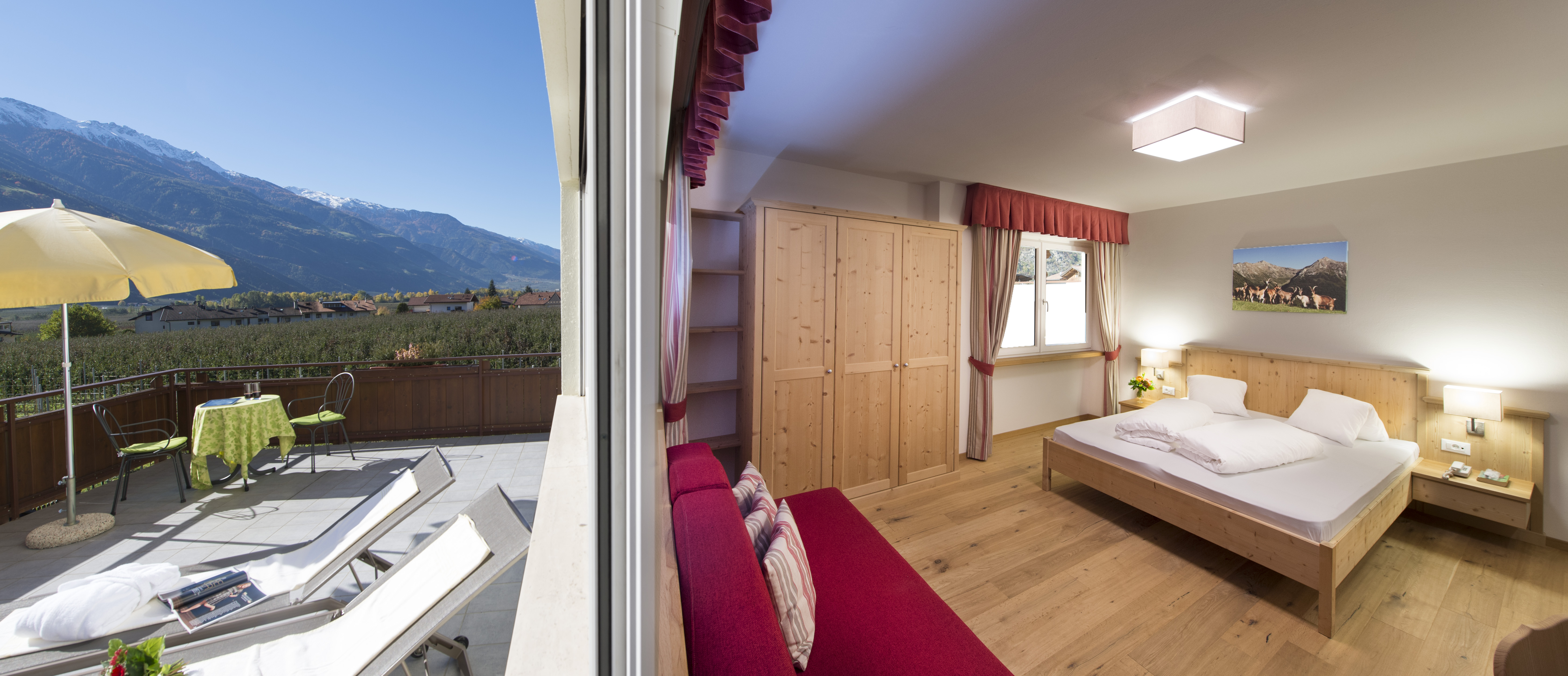 Juniorsuite mit Schreibtisch, Sitzgelegenheit und Schlafcouch,Sat-TV, Radio, Tresor, Telefon, Minibar, Badezimmer mit Dusche/WC, Haarföhn, Loggia zur Westseite mit Blick in den Vinschgau.