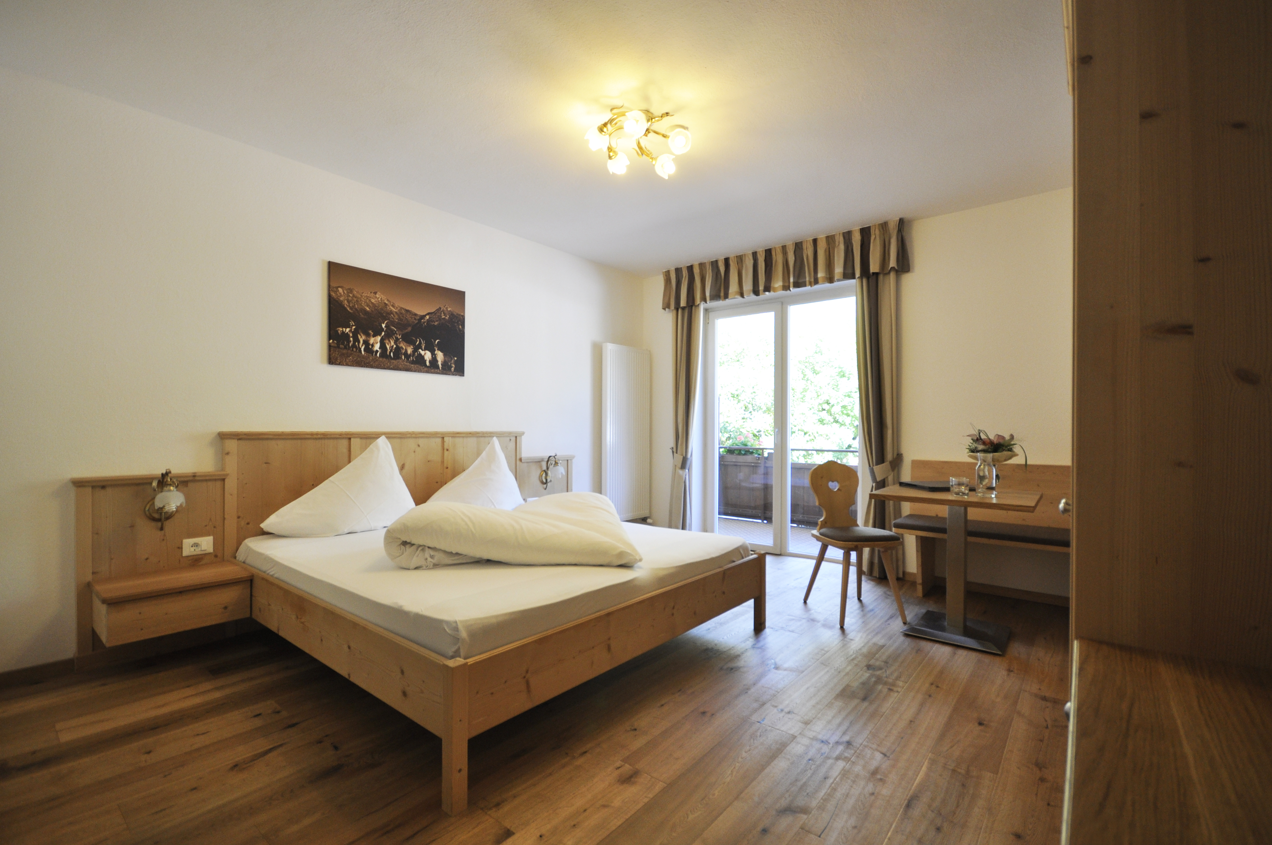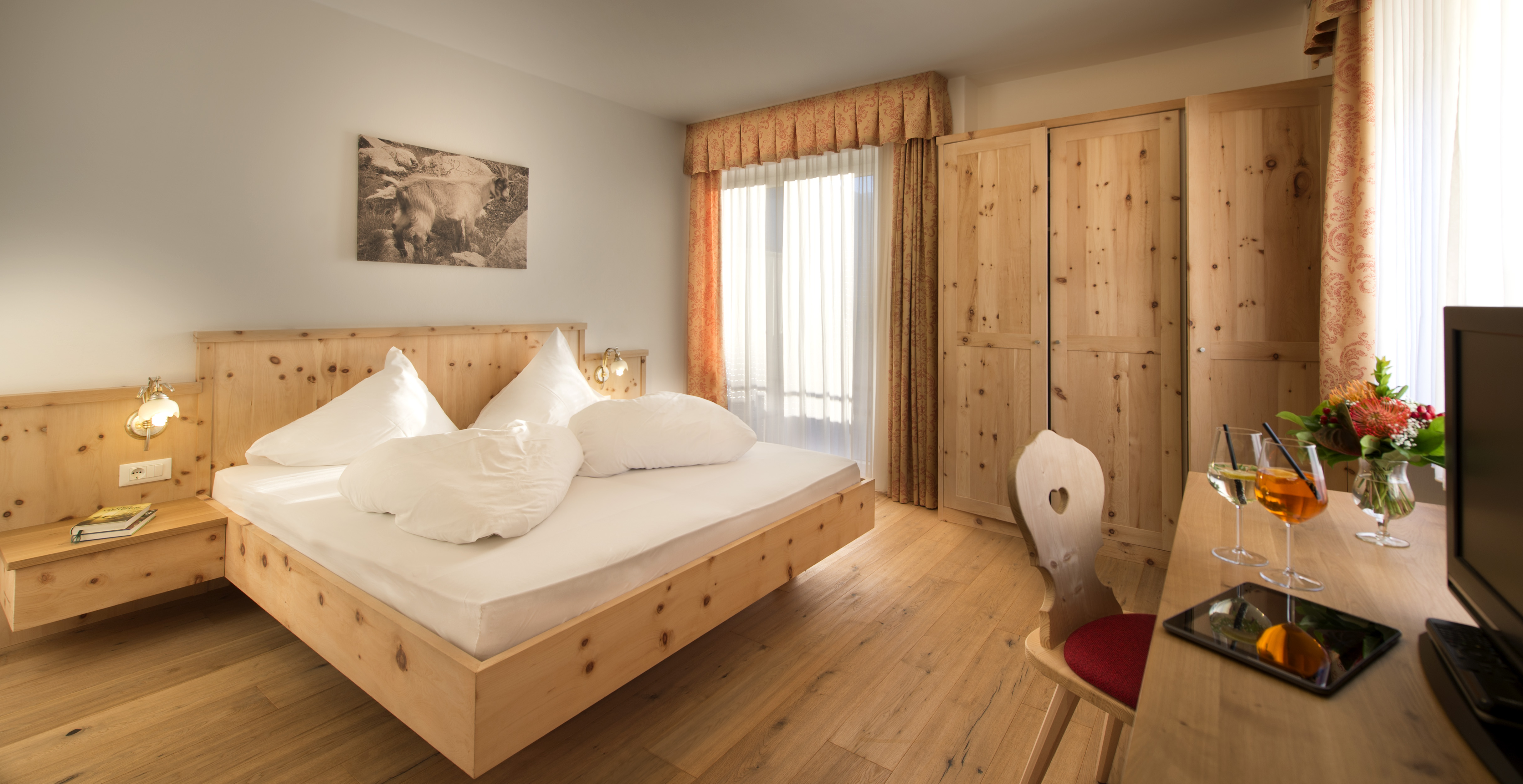 Komfortables Doppelzimmer in Zirbenholz mit Schreibtisch, Holzfußboden, Sat-TV, Radio, Tresor, Telefon, Minibar, Badezimmer mit Dusche/WC, Haarföhn, Westbalkon mit Blick in den Vinschgau.