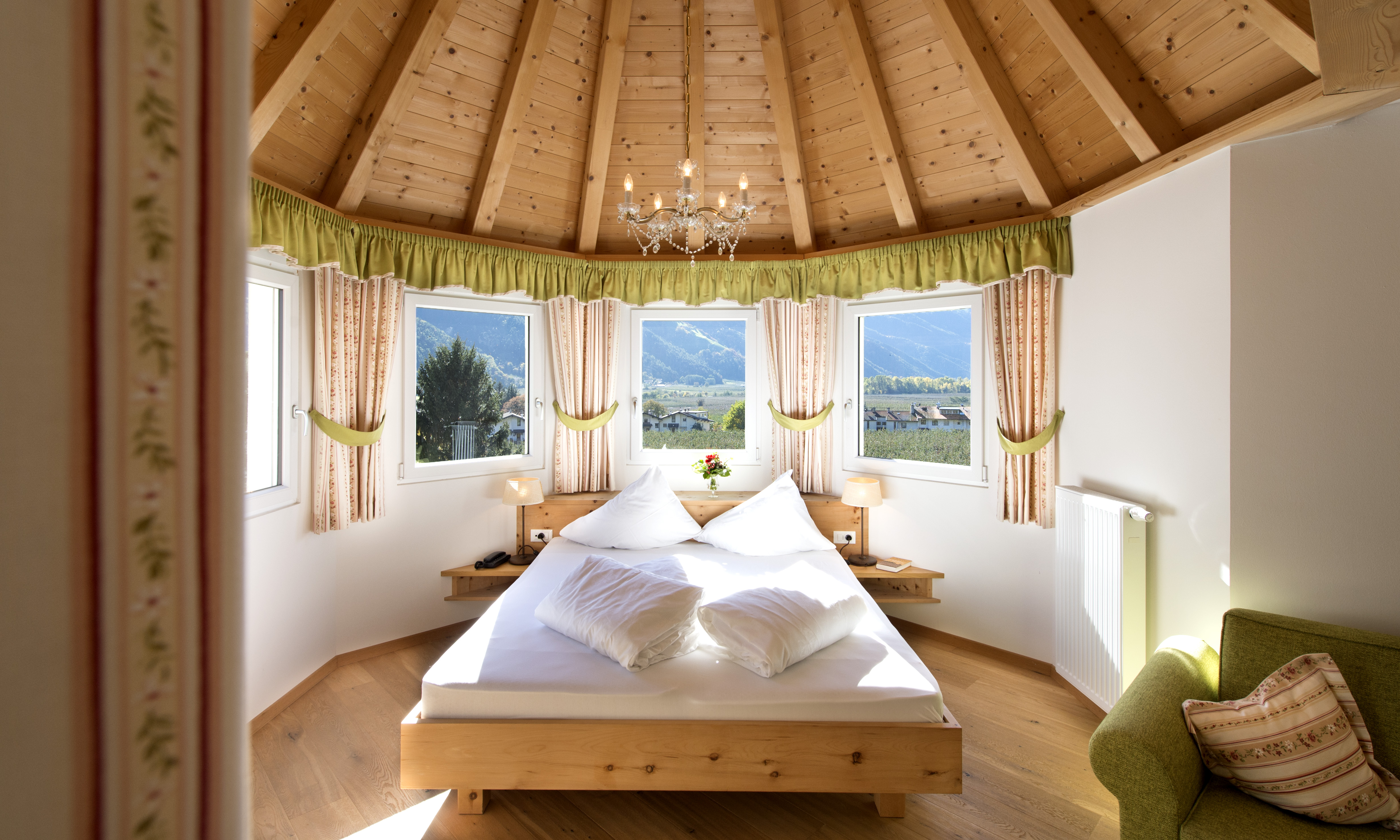 Exklusive, ruhige Turmsuiten mit besonderer Ausstattung: Möbel in Zirbenholz, Doppelbett im Erkerturm integriert, Eckbank mit Tisch, Doppel-Schlafcouch, Flatscreen-Sat-TV, Radio, Tresor, Telefon, Minibar, Badezimmer mit Badewanne und Dusche/WC, Haarföhn, Südbalkon mit Blick Richtung Freibad/Garten.